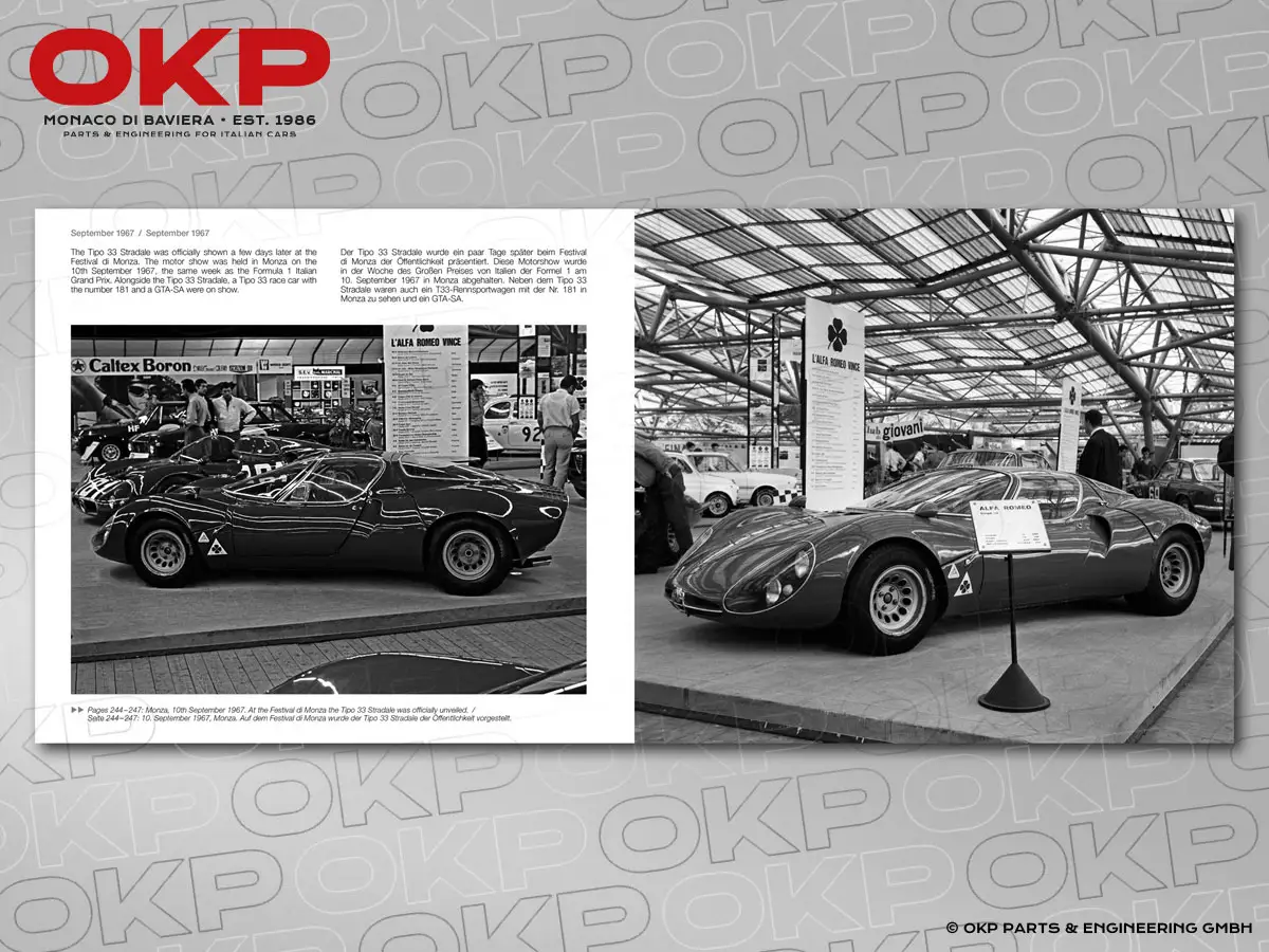 Neben den Rennaktivitäten des Tipo 33 wird in diesem Buch auch auf den Tipo 33 Stradale sowie auf den Alfa Romeo OSI Scarabeo eingegangen.